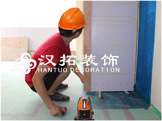 衣柜固定應(yīng)用紅外線水平儀調(diào)平,再用木楔釘入確保穩(wěn)固。