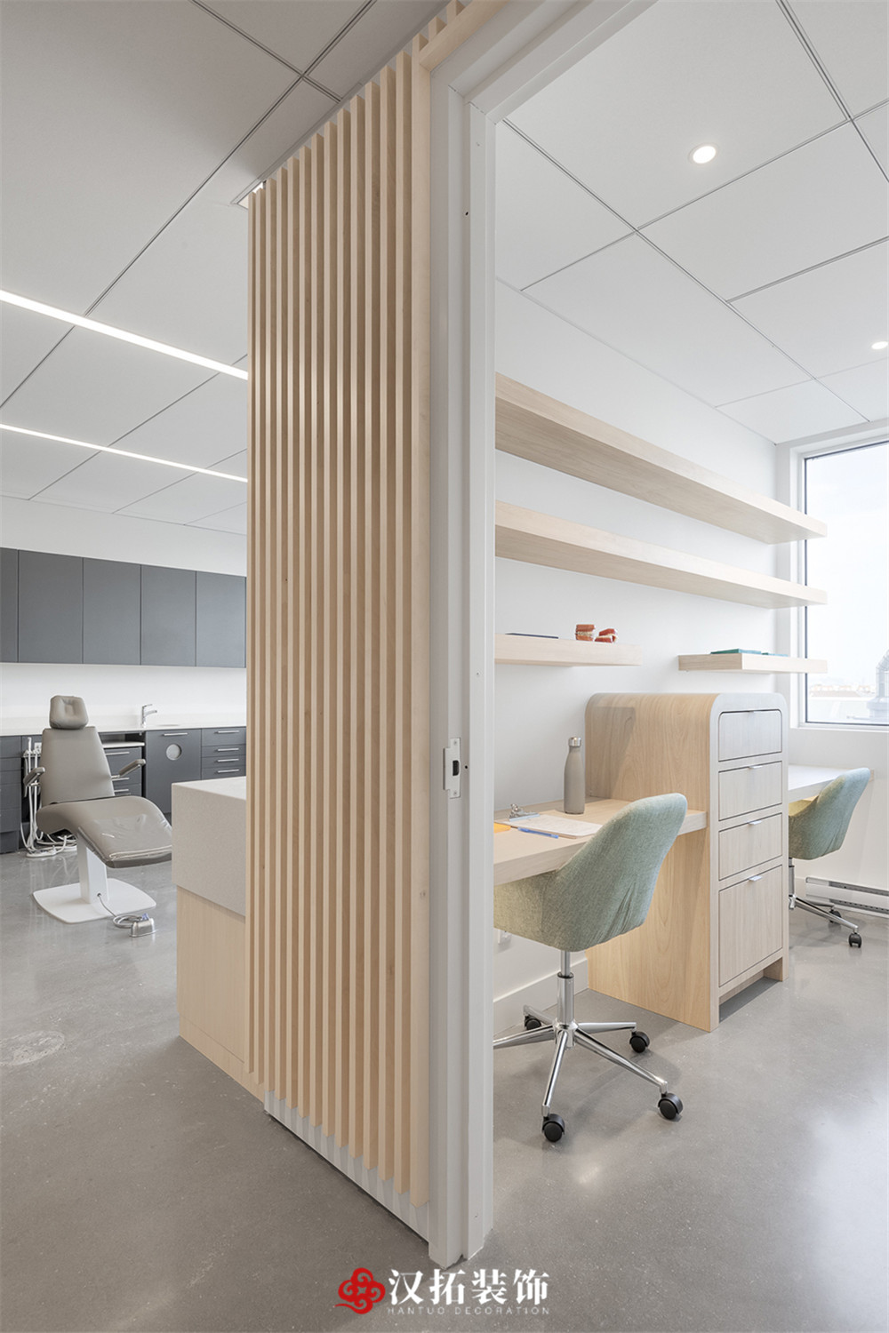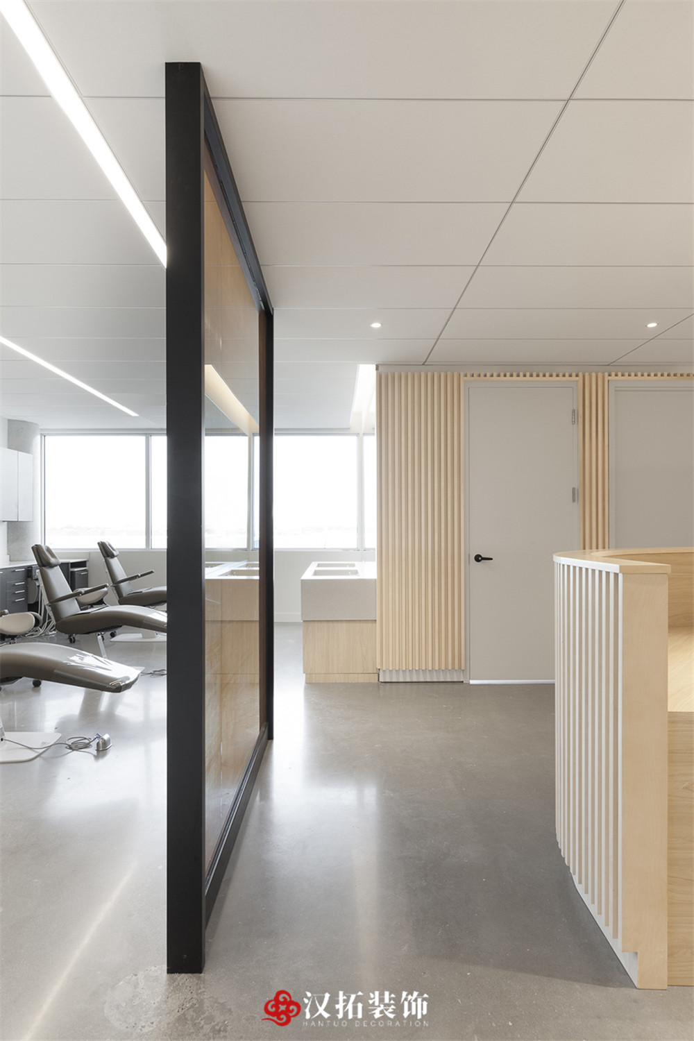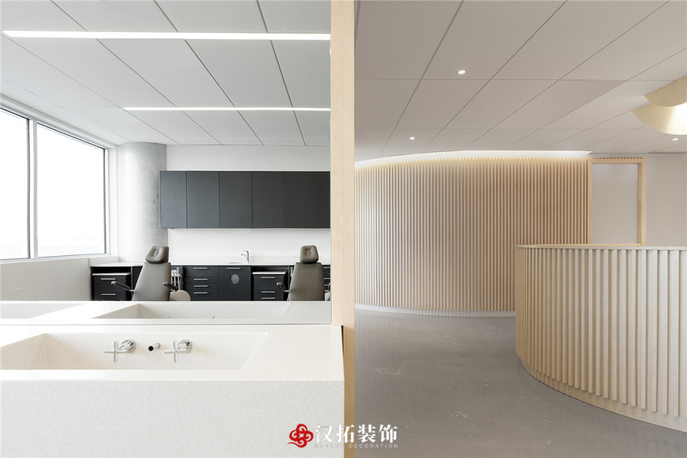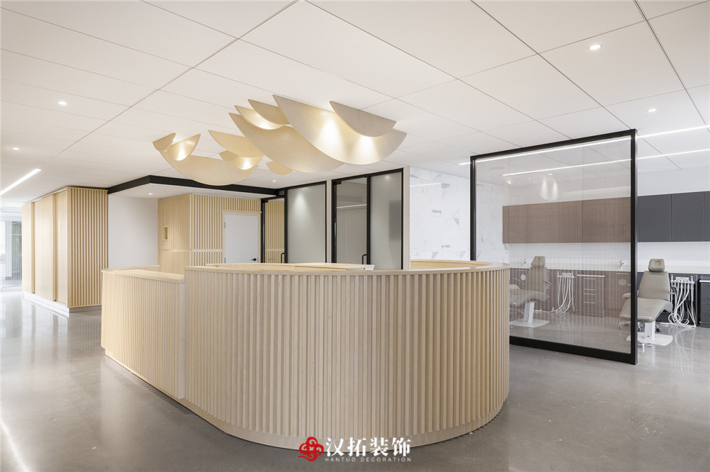 設(shè)計說明:專業(yè)口腔醫(yī)院,光影豐富,多層次,不規(guī)則的切面延伸出實心木管,平衡冷暖色調(diào)。在空間營造上達到“靜、雅、素、潔、適”的效果,使醫(yī)患之間有著良好的溝通氛圍,緩解各方內(nèi)心的焦慮、不安和躁動,營造平和、舒適、寧靜的就診環(huán)境。