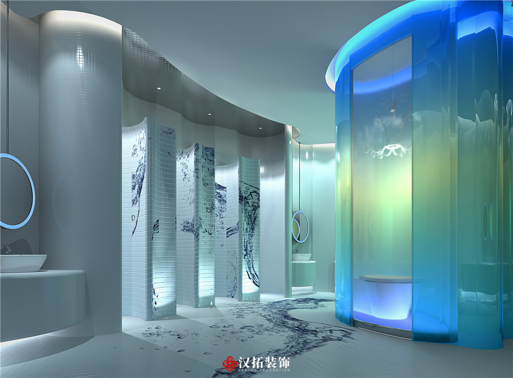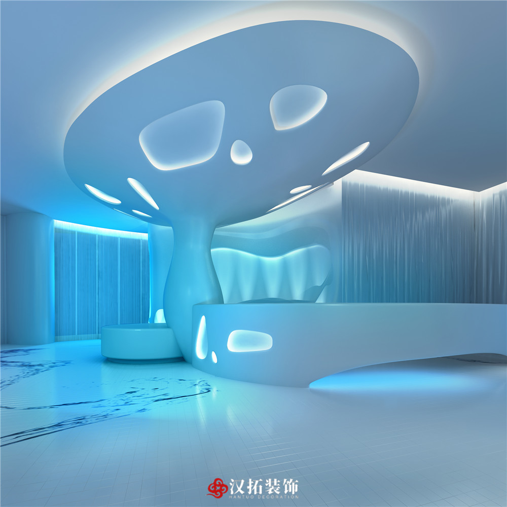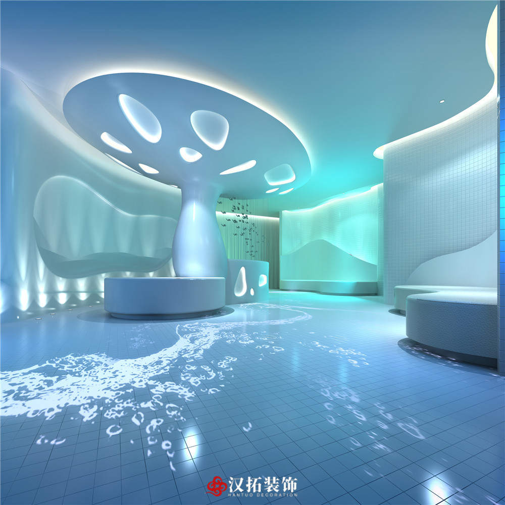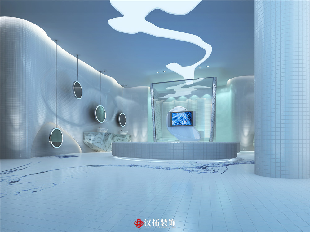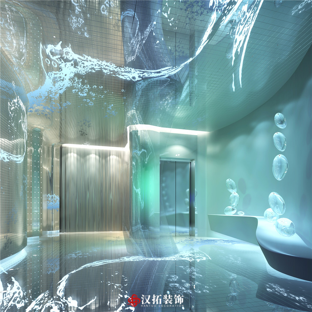 設計說明:整體以流水的通透感為設計理念,通過關系和材質的折射,提升空間的時尚感和設計感,視覺上有很強的吸引力,使人仿佛置身于潺潺流水之中,整個人身心放松。