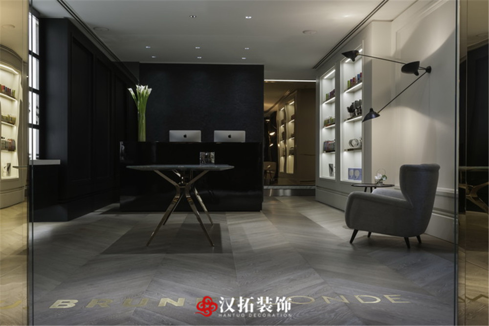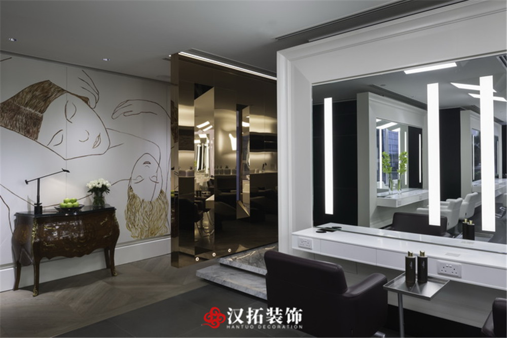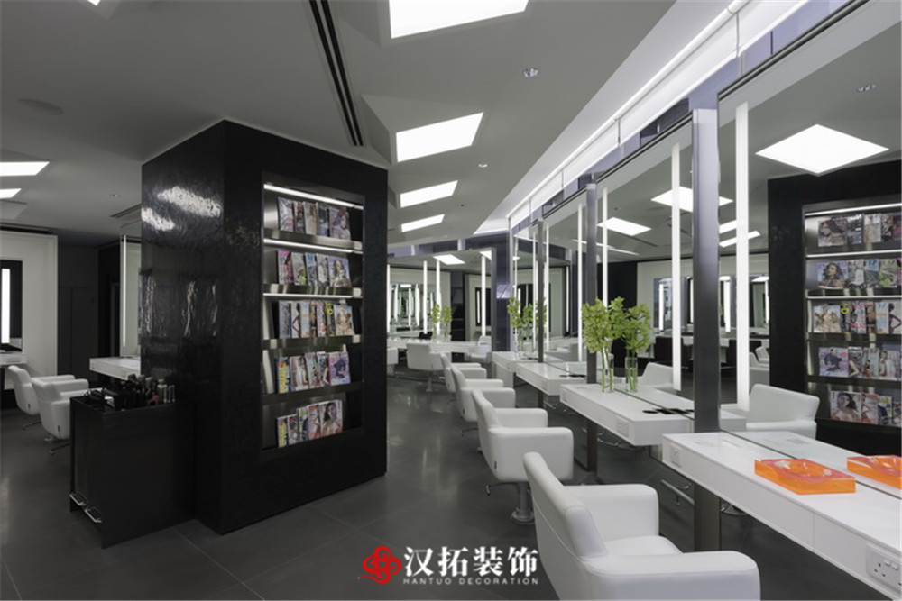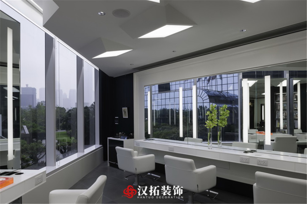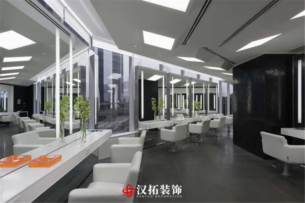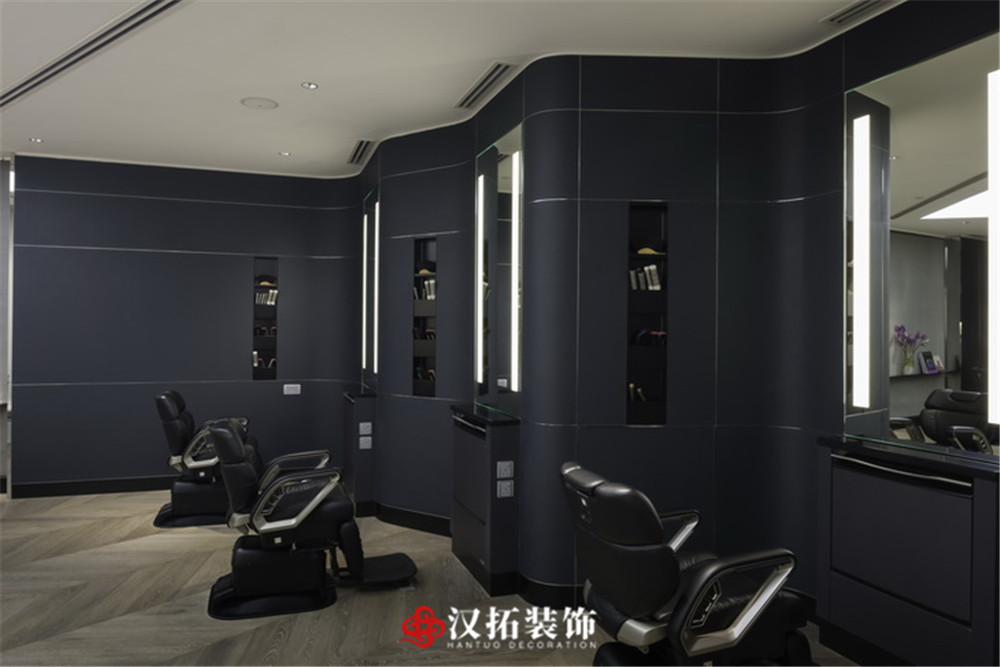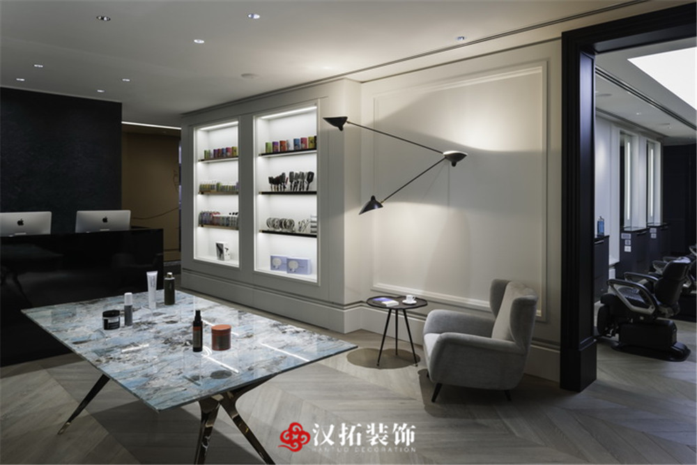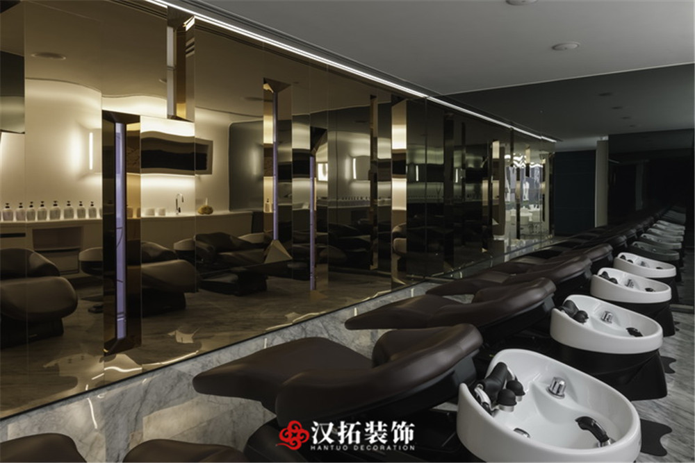 設(shè)計(jì)說明:理發(fā)區(qū)整齊劃一的座位排布,形成規(guī)整的序列,燈光被調(diào)節(jié)到最為適合工作的狀態(tài),明亮卻不刺激。在簡單利落的空間格局中,各場域緊密地串聯(lián)合一,使整個分各個統(tǒng)一干練。