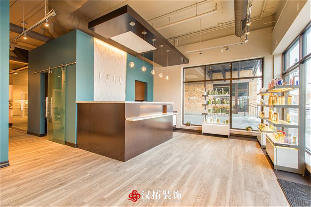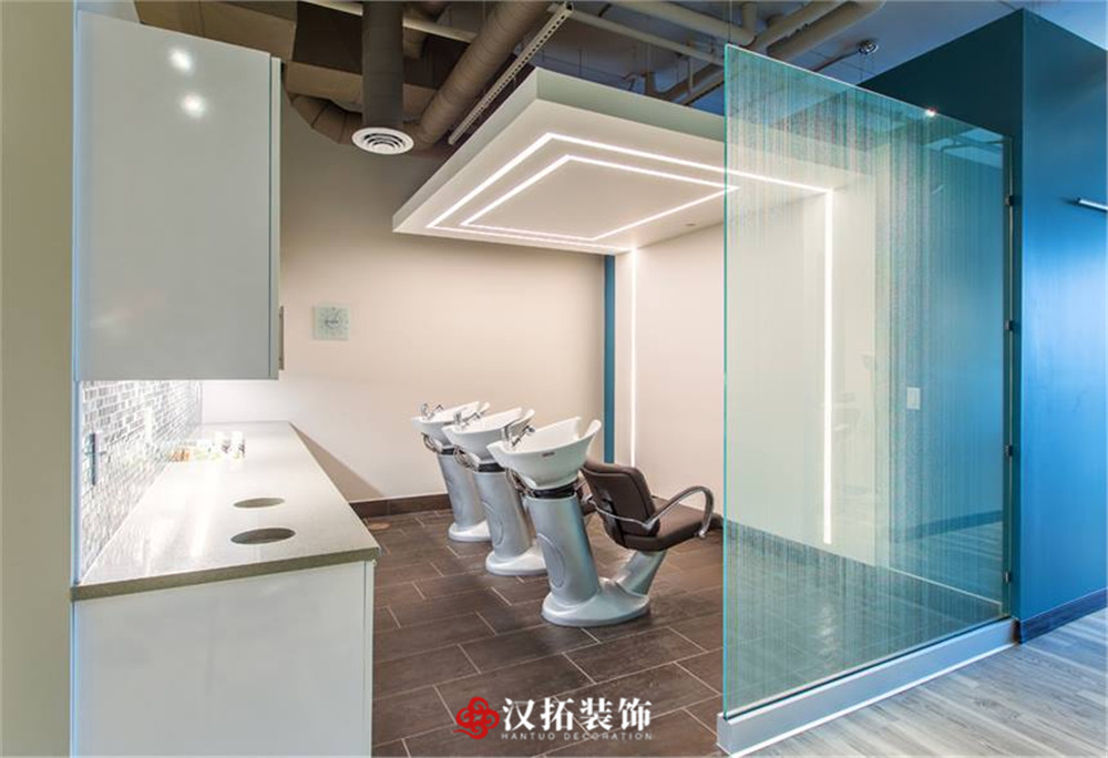 設(shè)計(jì)說(shuō)明:整體為小清新色調(diào),墻面用天藍(lán)色點(diǎn)綴,讓人心情輕松愉悅,休閑區(qū)備有小零食,讓客戶在等待過(guò)程中不無(wú)聊,充分滿足客戶的需求,提高客戶的體驗(yàn)感。