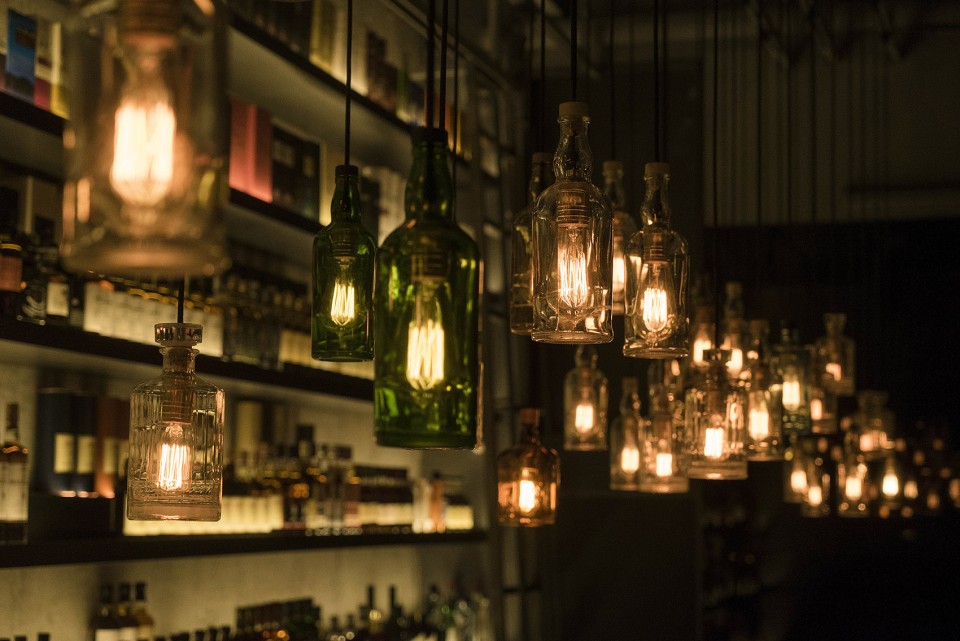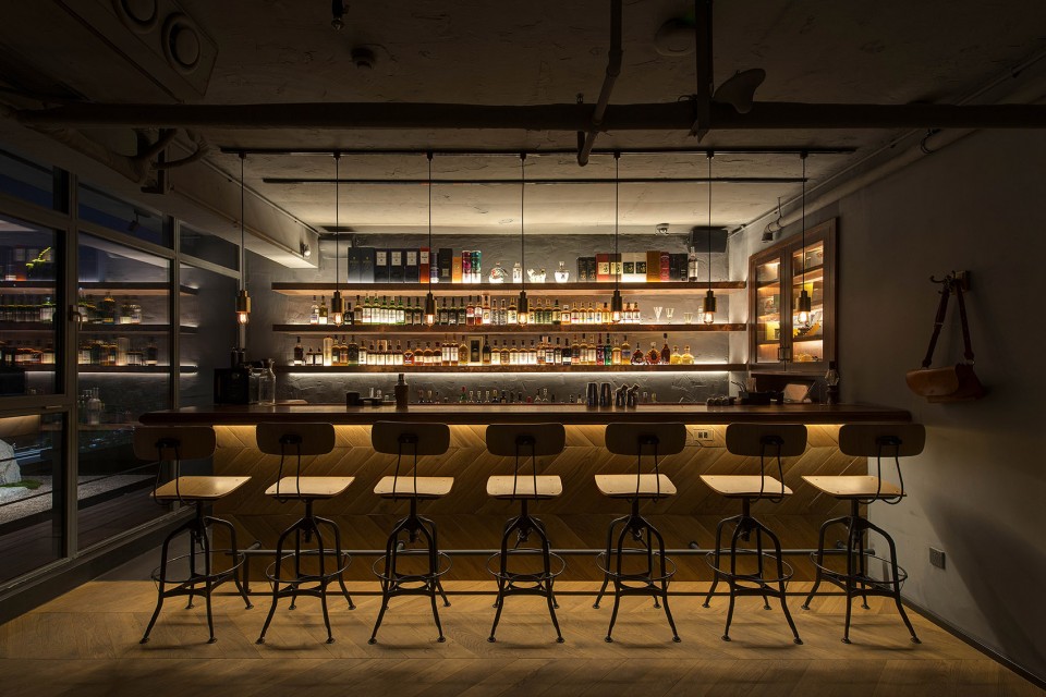 設(shè)計說明:設(shè)計師對于酒店的裝修設(shè)計十分用心,一邊是難能可見的各類特殊藏酒,一邊是十米高的酒墻,各類威士忌酒琳瑯滿目。吧臺上方一排用各類威士忌酒瓶改造的吊燈,琳瑯滿目,燈泡、鎢絲閃閃發(fā)光,通過玻璃折射出魅惑的光。