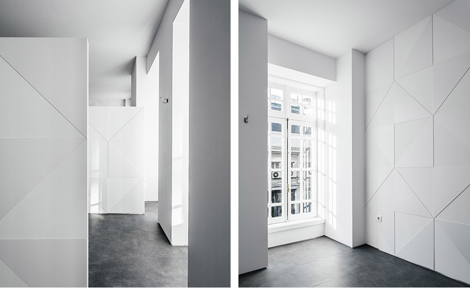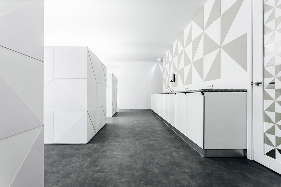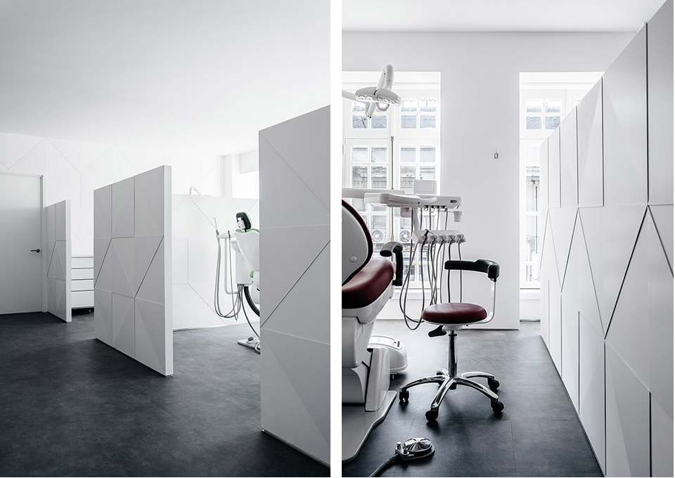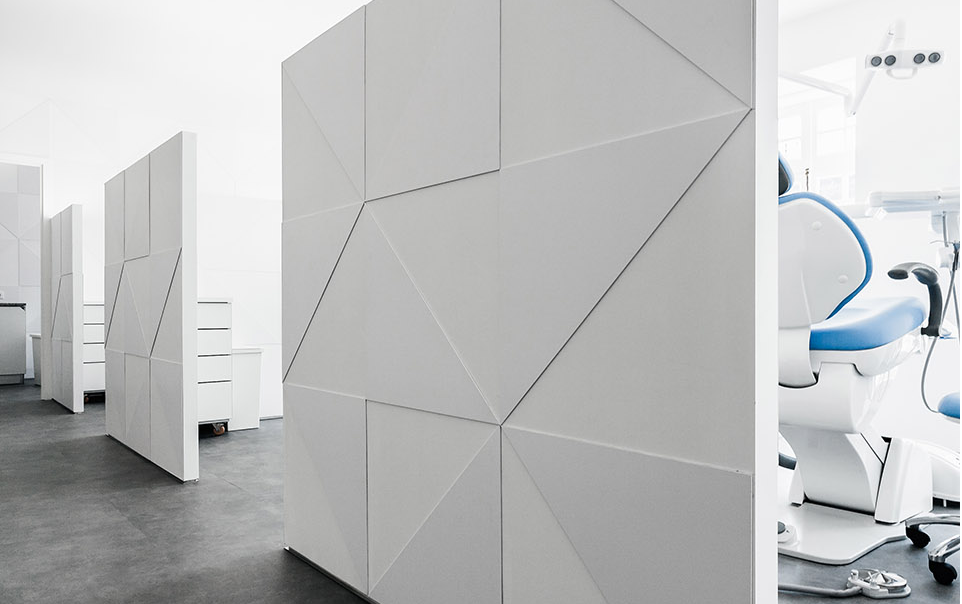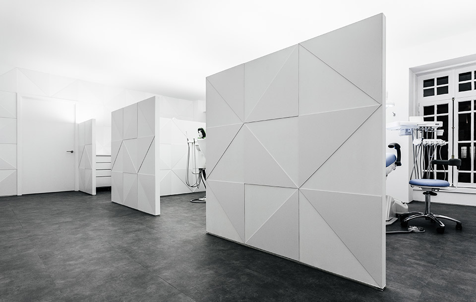 設(shè)計說明:項目中的幾何圖案被運用在墻壁,家具,照明和門板上。采用三種材料詮釋:石膏板墻,PVC面板以及波雷爾毛紡織物–其可以運用在墻面上當吸聲板。在等待室,照明燈具也融于墻面的圖案,此外房間中的等候長椅也運用了設(shè)計中的三角形特色元素。一道印有設(shè)計圖案的門隔開了等候室和診療場所,進入診療場所,四個治療位被低隔斷分割,剩下一個治療位因為采用X射線系統(tǒng)而被墻壁完全的分割。此外還有一個辦公室,工作室,更衣室,以及浴室。