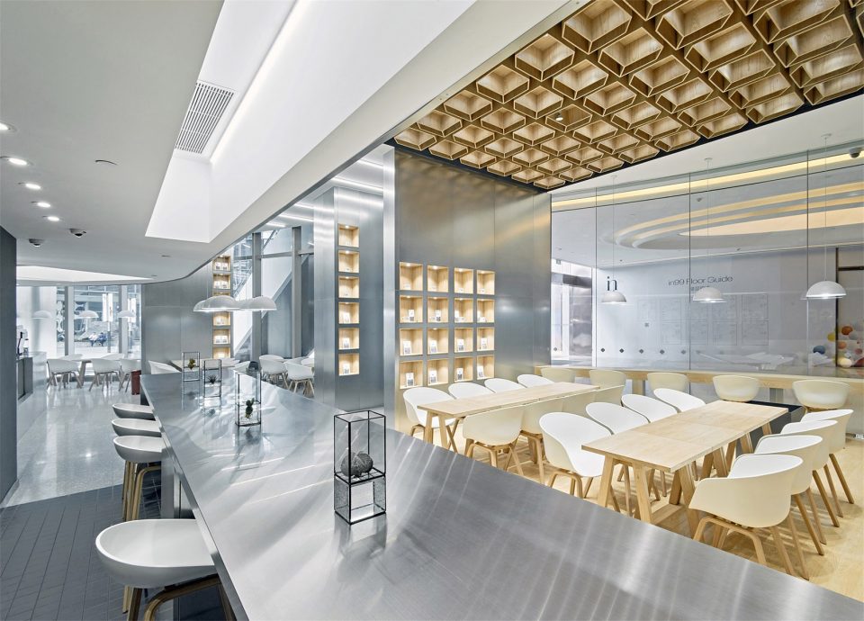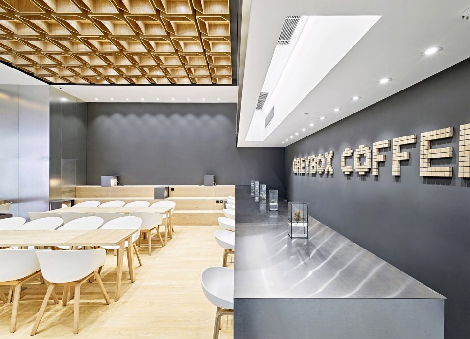 設(shè)計說明:設(shè)計師結(jié)合了業(yè)主的理念,試圖用設(shè)計的手法來制造一種“喝咖啡的儀式感”。不同于一般的咖啡廳那種濃烈的小資情調(diào),東緹咖啡廳是有自己的特殊企業(yè)理念的,東緹的負責(zé)人希望咖啡也能喝出儀式感,希望一杯咖啡,從開磨到?jīng)_泡到制作,到最終呈現(xiàn)在食客的面前,都是標準化的、工業(yè)化的、可視化的一個過程。做咖啡的過程就如同身處實驗室,因此,漢拓設(shè)計師對于該咖啡廳的設(shè)計首先從燈光入手,并沒有采用其他咖啡廳昏暗燈光配慢搖的風(fēng)格,而是給予了明亮的射燈造型,讓制造咖啡的每一個過程都清晰無比的得以呈現(xiàn),也體現(xiàn)了企業(yè)標準化的訴求。