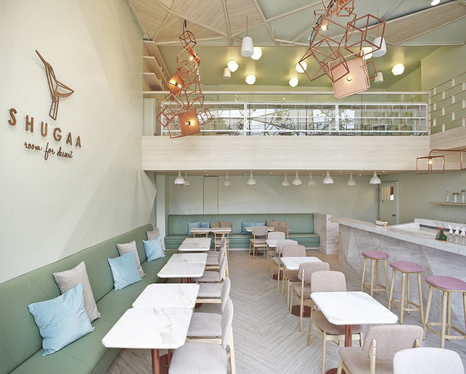 裝修理念:該店是由南京漢拓裝飾裝修設(shè)計(jì)的。室內(nèi)設(shè)計(jì)的概念是從糖的基本構(gòu)成即其糖分子和晶體的形式而來。從室外透過玻璃外墻向內(nèi)看,懸掛在眼前的是晶體一樣的多邊形構(gòu)架。此外,在設(shè)計(jì)中使用木質(zhì)材料融合薄荷綠的顏色,打造出溫暖樸實(shí)的氛圍。設(shè)計(jì)師團(tuán)隊(duì)還通過使用玫瑰金顏色和大理石吧臺(tái)增加了幾許現(xiàn)代和奢華。