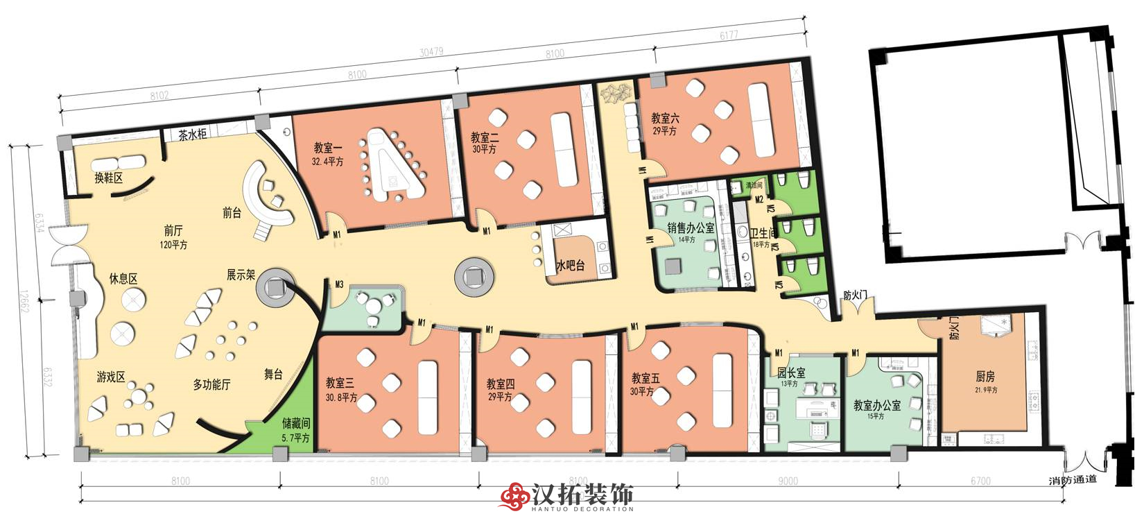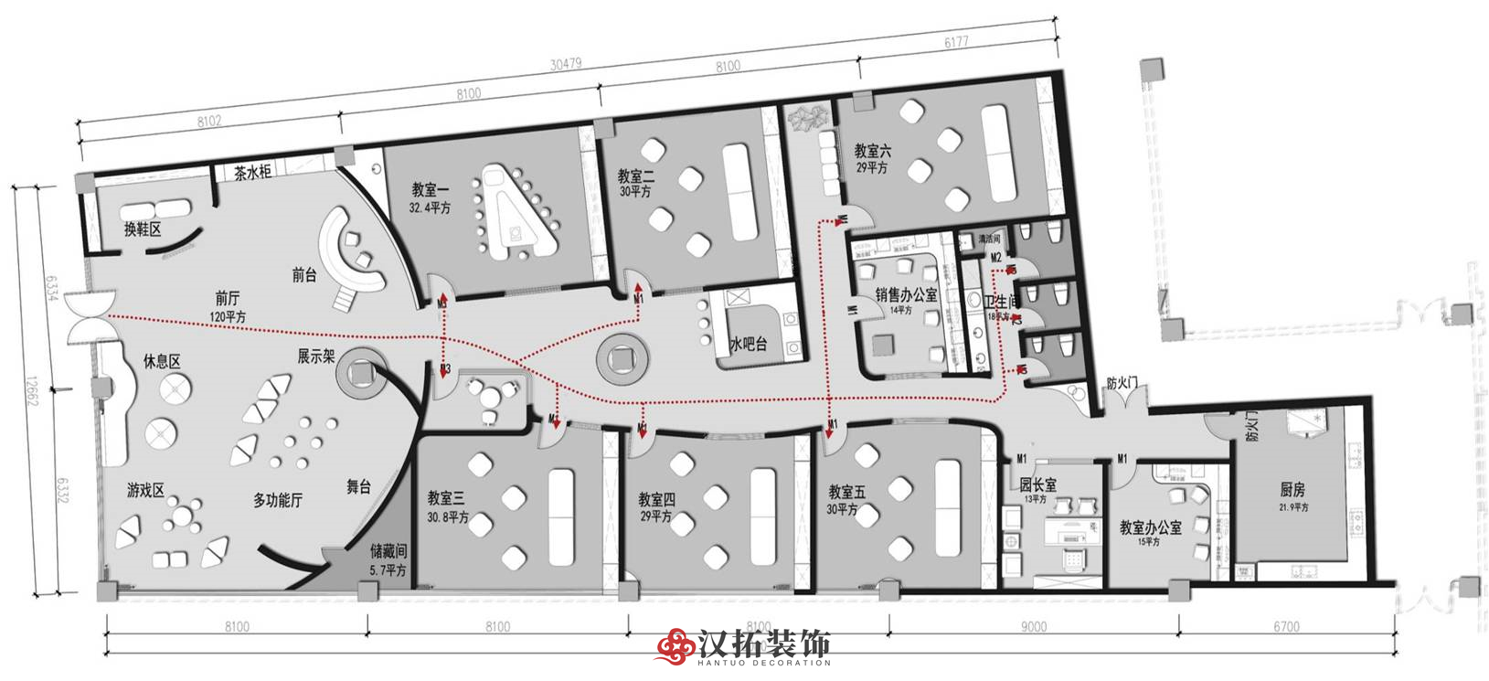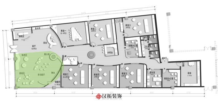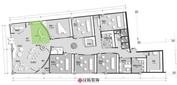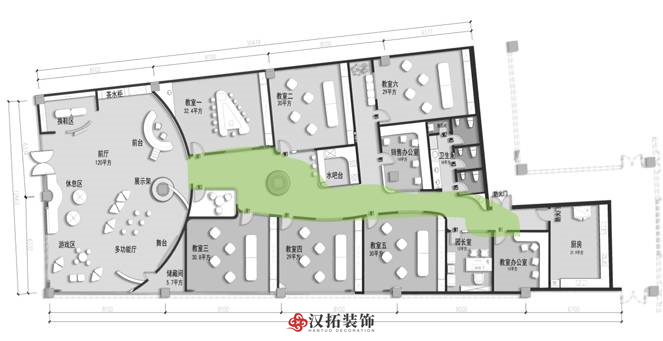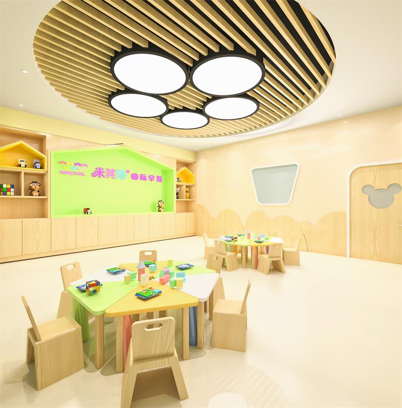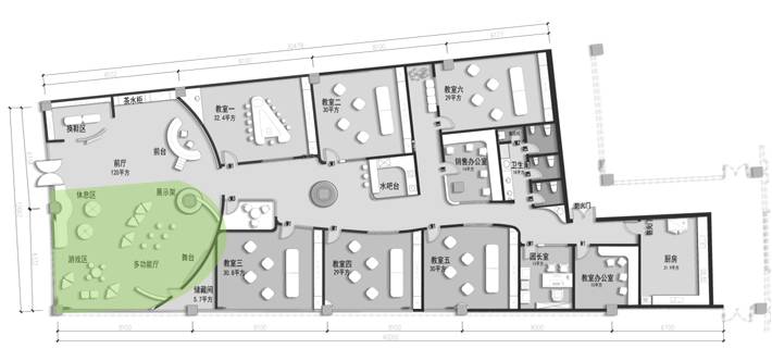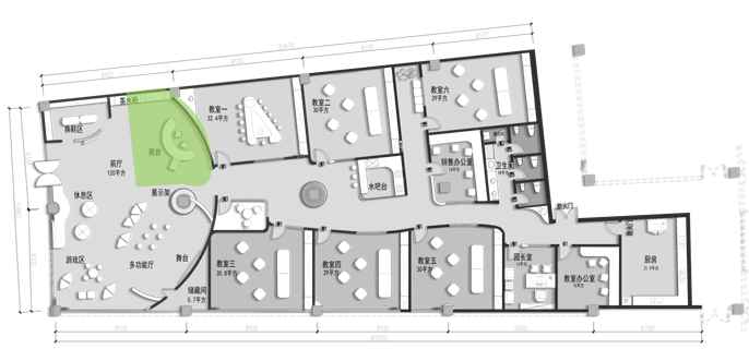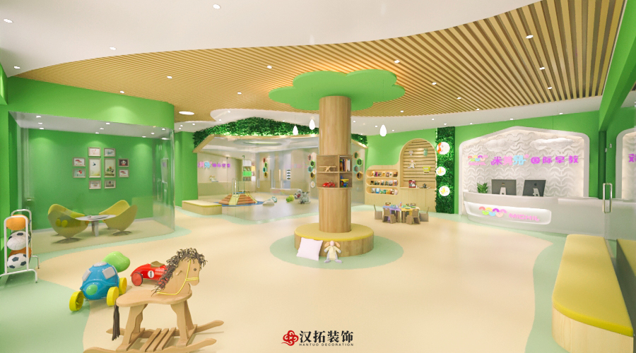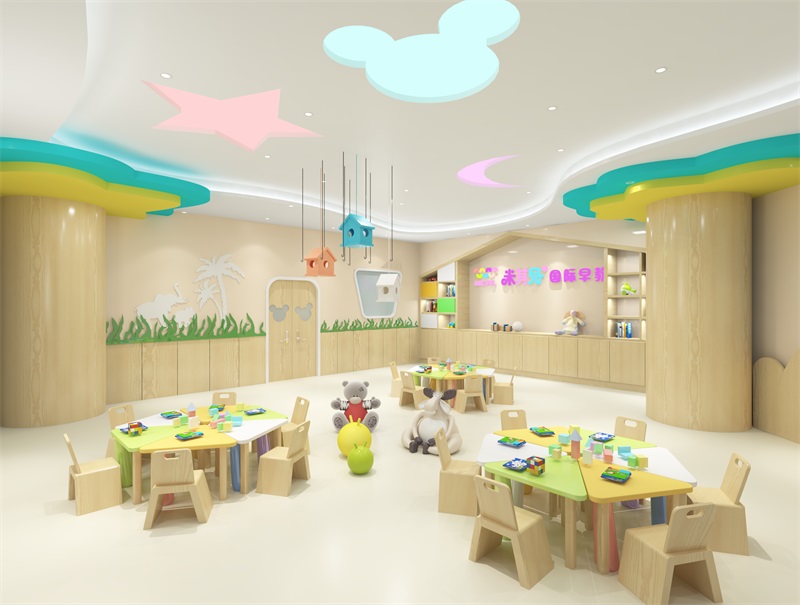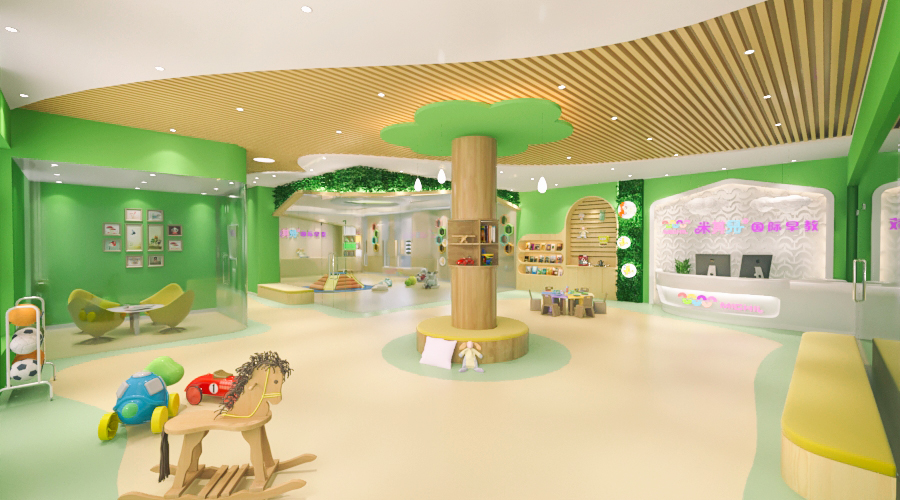前廳120平,增加小舞臺區(qū),家長或路過的群眾在門外就能看到園方的兒童或親子表演,增加人氣。我們把通道做成異形,擯棄傳統(tǒng)的方正規(guī)矩,顯得格外與眾不同,因為是總店,對空間是有一定要求的,一定要做到與其他園區(qū)的差異性,對品牌宣傳,對招生都是有利的。這點園長也非常認(rèn)同我們,最終達(dá)成一致的合作意向。