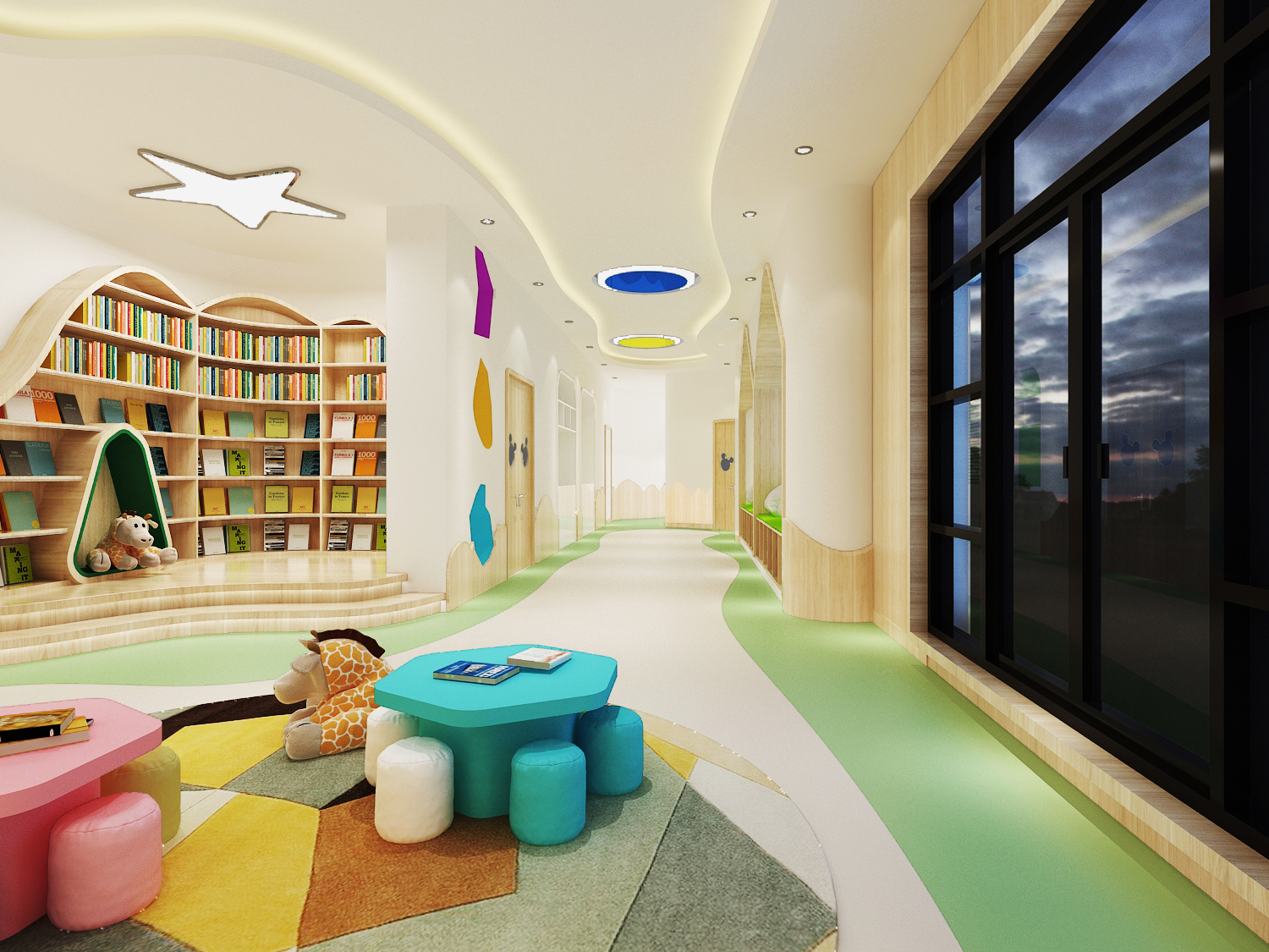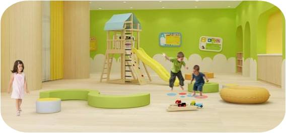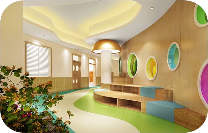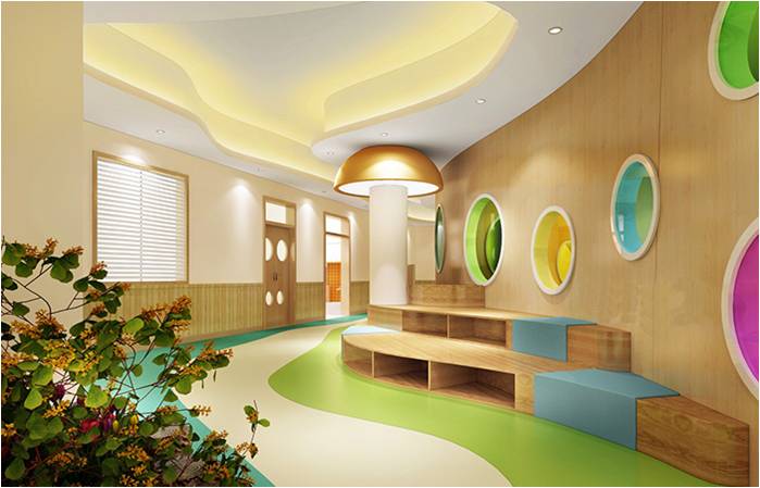 過道的設(shè)計突破傳統(tǒng),異形空間,給孩子神秘感,蜿蜒曲折讓孩子的探秘童心迸發(fā)出來,地面地膠與頂面石膏板吊頂造型協(xié)調(diào)統(tǒng)一,使不規(guī)則的空間也顯得錯落有致。