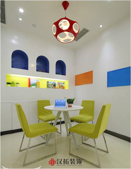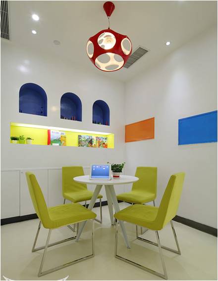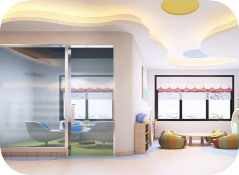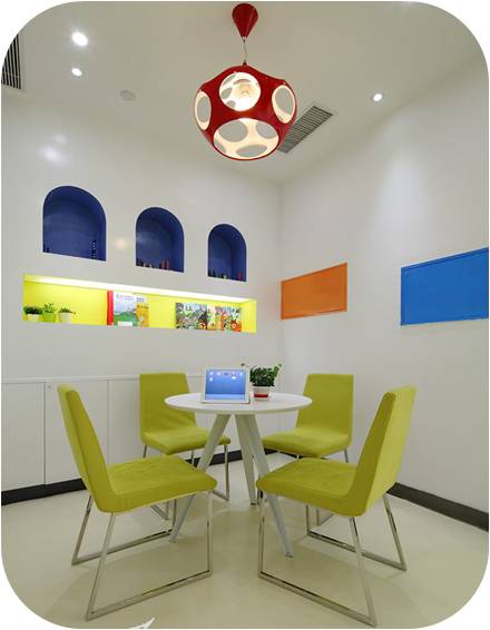 咨詢室靠近前廳及教室,家長咨詢時能看到前廳的動態(tài)以及校區(qū)內(nèi)孩子的狀態(tài),加上隔墻用透明鋼化玻璃,能夠觀察到全局,給家長很好的視覺效果,我們建議不用或少用玻璃,在孩子夠得到的地方使用玻璃時建議做防爆玻璃。