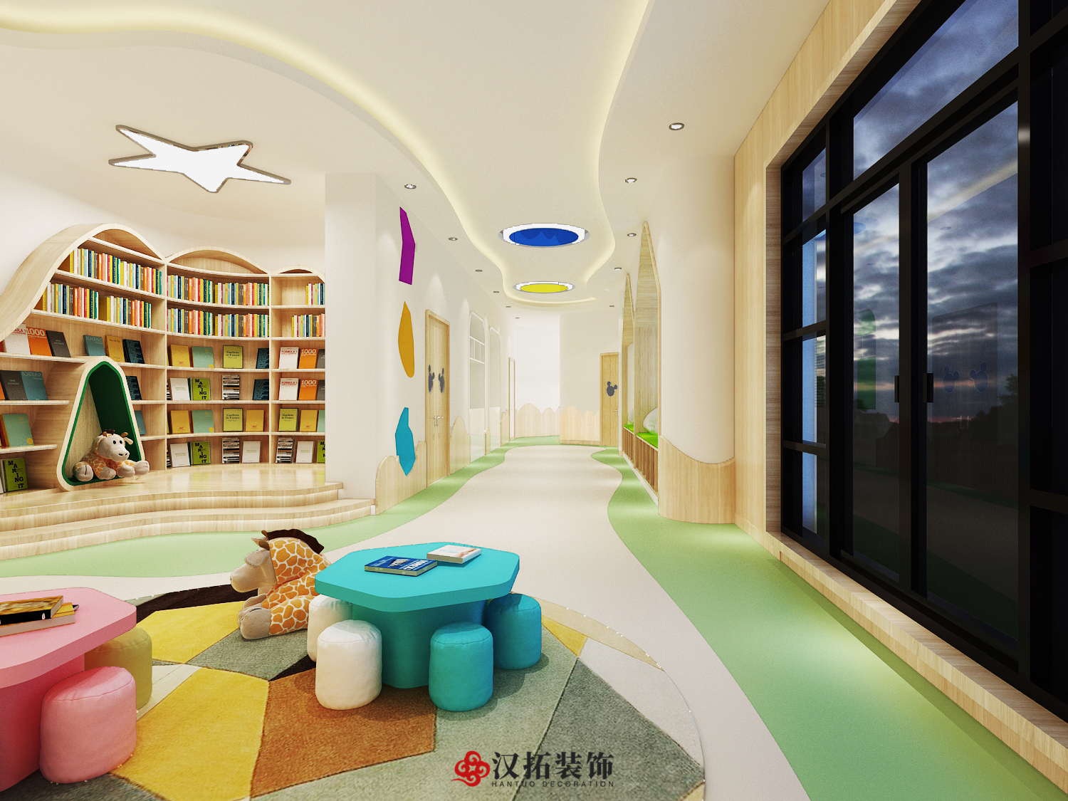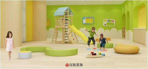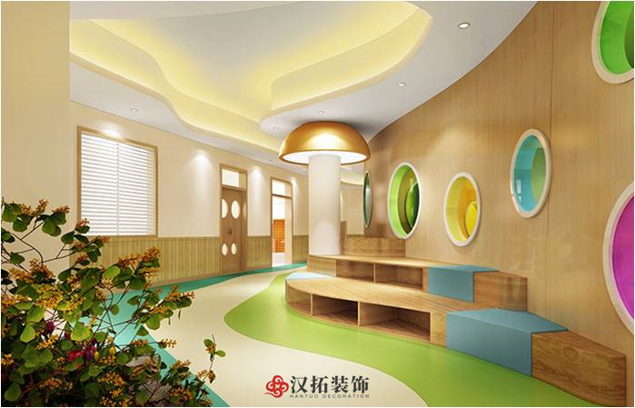 大廳的游樂區(qū)考慮做弧形,也寓意團(tuán)圓,圓形空間讓孩子很有趣味性以及心里的安全性,隔斷的環(huán)保涂料噴涂,色彩豐富,整體顯得很活躍,孩子可以在圓洞里爬來爬去,非常有趣味性。