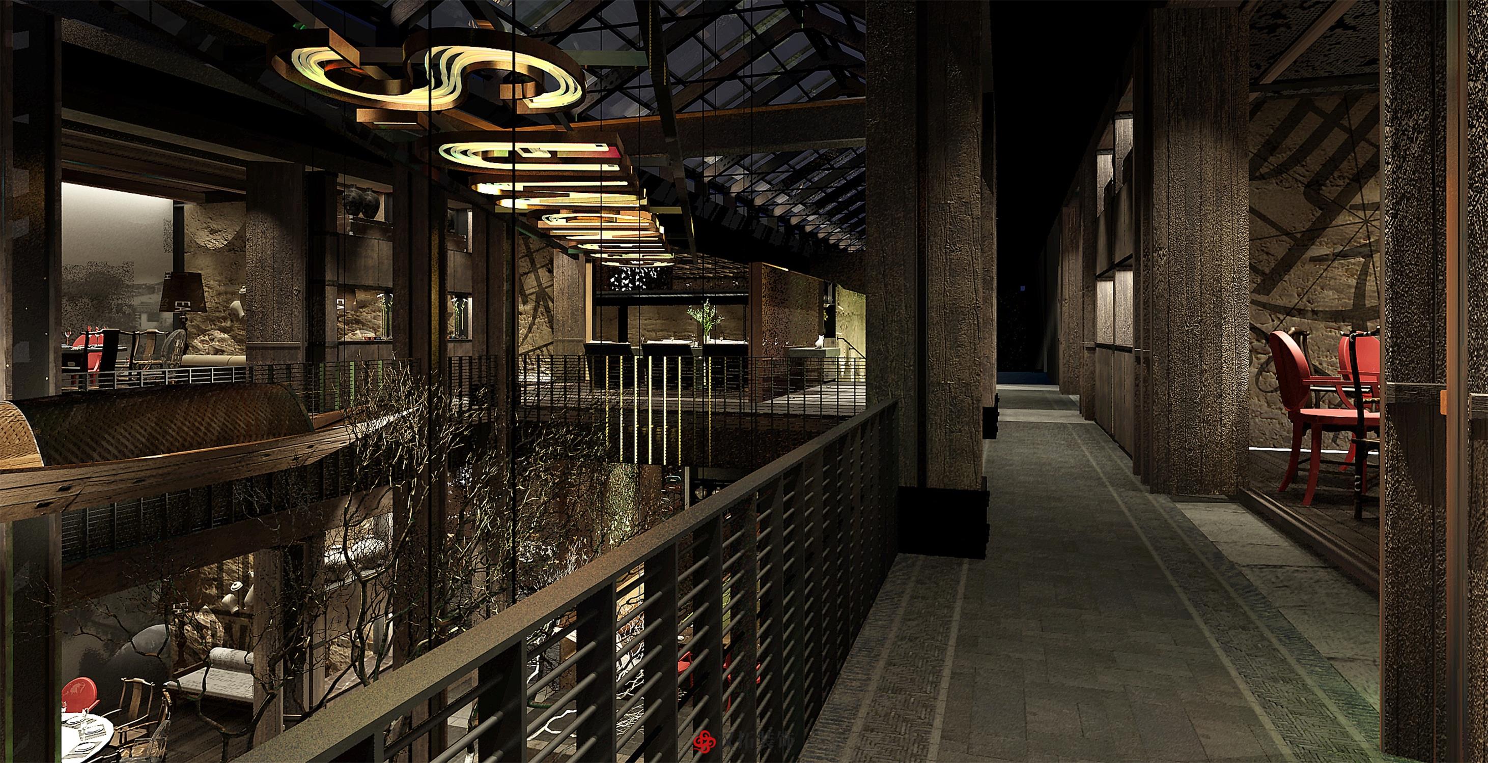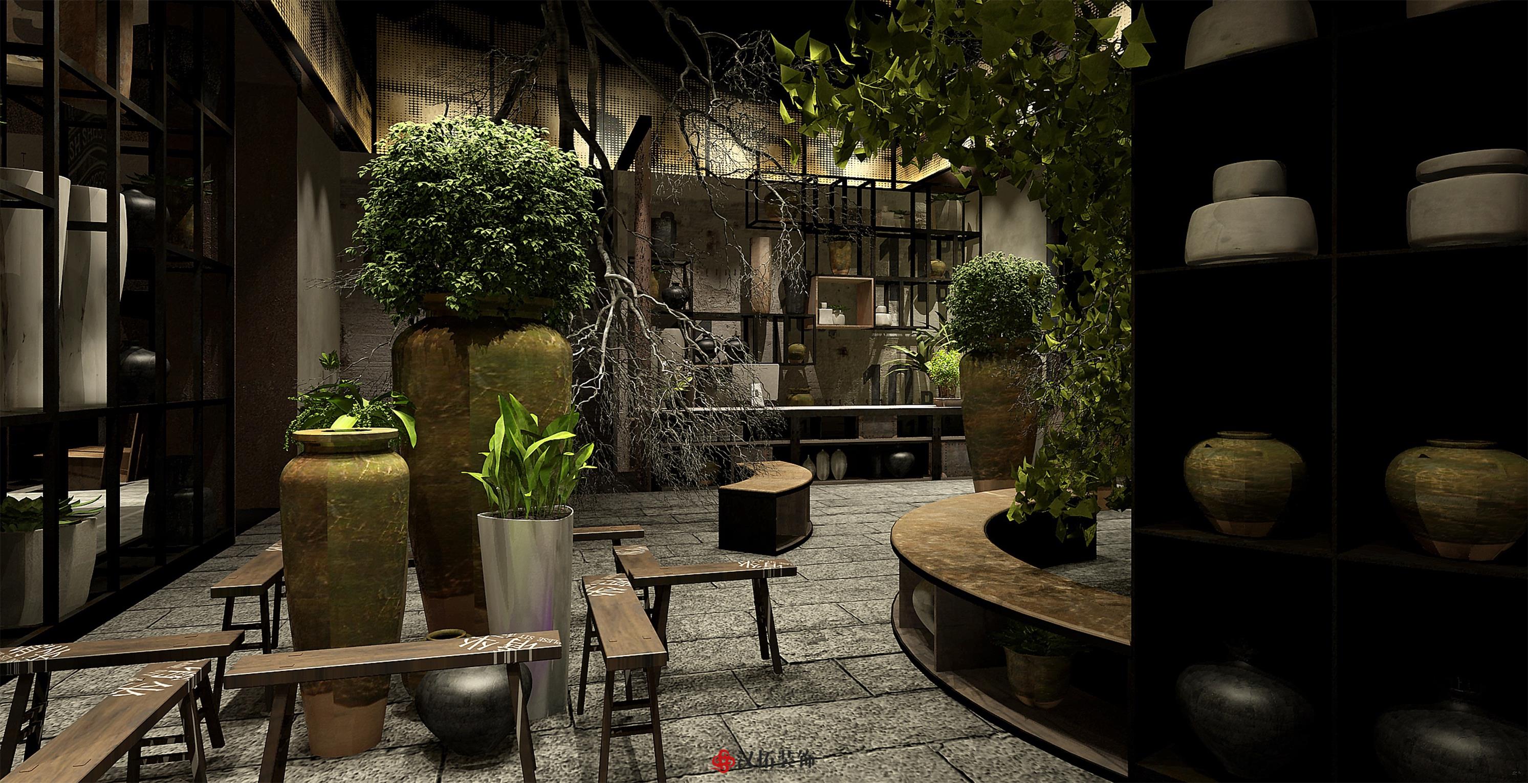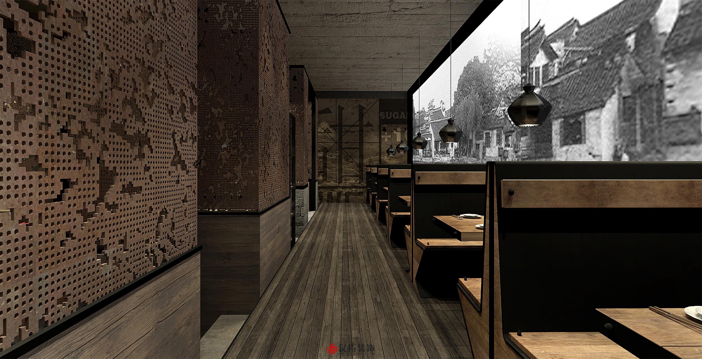 設(shè)計(jì)說(shuō)明:以傳統(tǒng)的深色中式古董木桌為中心, 搭配長(zhǎng)條板凳、扶手椅和小圓凳,座位周?chē)粲? 充裕的空間以便上菜、敬酒時(shí)可自由走動(dòng)。墻體 材質(zhì)顏色以淺色為主,使周?chē){(diào)呈現(xiàn)出樸素和 溫馨感,地面鋪設(shè)深色木地板,配合偏暗的暖色 燈光,將古樸典雅的氣氛烘托出來(lái)