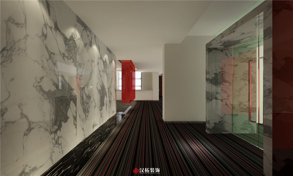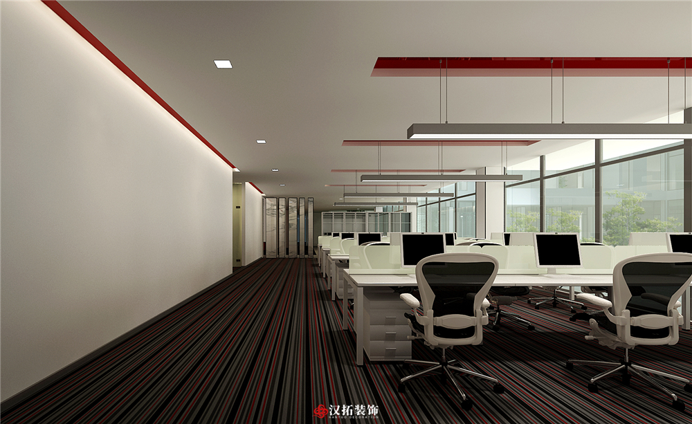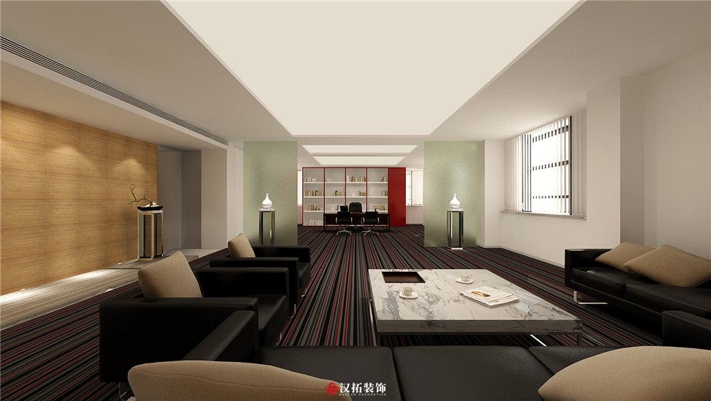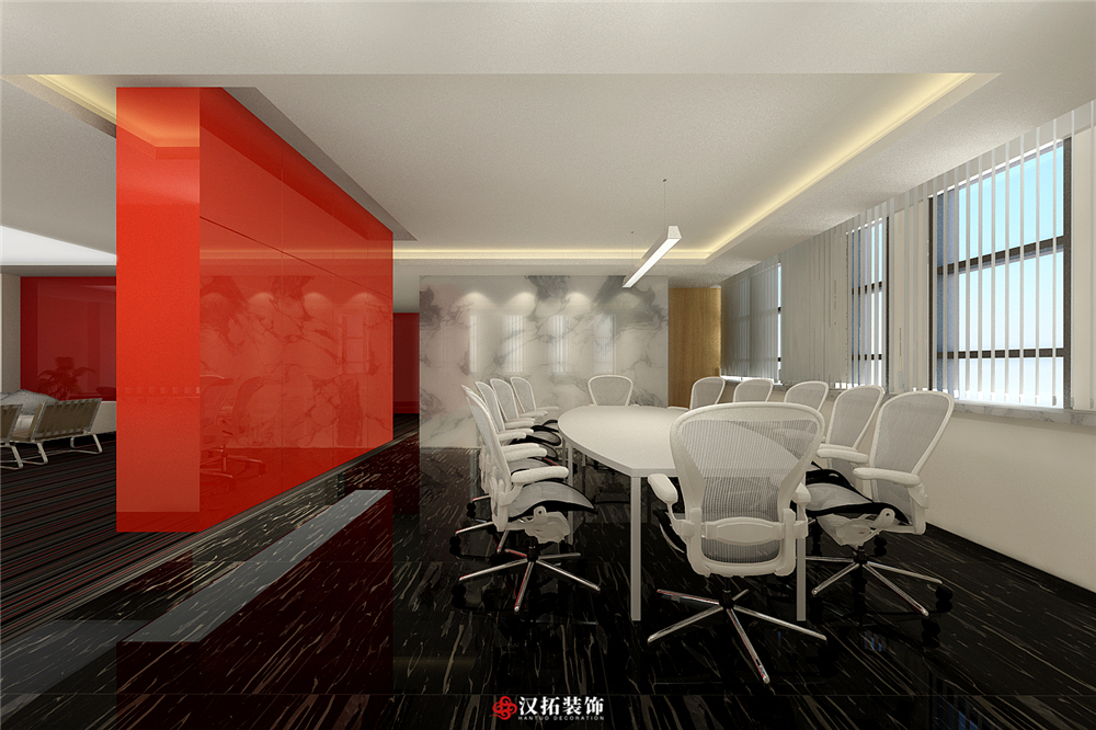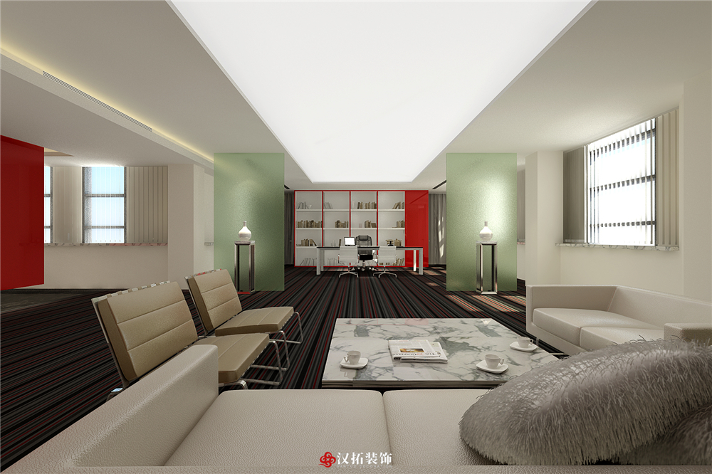 設(shè)計說明:預(yù)算:52萬 將明度較高的綠引入辦公室,再加以紅色的撞色設(shè)計,使人眼前一亮